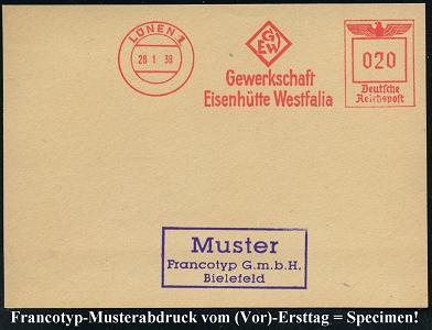 8098 | 35 € | PL-Raum 46.. (ohne Dortmund, Bochum, Gelsenkirchen) : LÜNEN 1/ GEW/ Gewerkschaft/ Eisenhütte Westfalia 1938 (28.1.) AFS-Musterabdruck Francotyp "Reichsadler" (Monogr.-Logo) glasklar gest. Francotyp-Musterblatt vom (Vor)-Ersttag !, selten! (Dü.E-5CGo) | ![]() ![]() | |