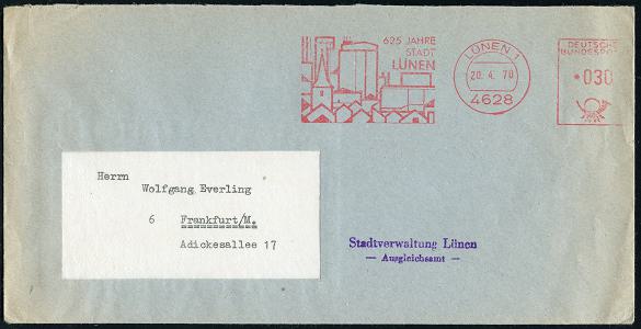 8101 | 10 € | PL-Raum 46.. (ohne Dortmund, Bochum, Gelsenkirchen) : 4628 LÜNEN 1/ 625 JAHRE/ STADT/ LÜNEN 1970 (20.4.) Jubil.-AFS Francotyp (Stadtbild) + viol. viol. 2L: Stadtverwaltung Lünen/ - Ausgleichsamt - (Dü.E-26) | ![]() | |