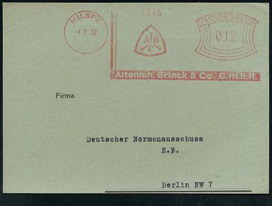8102 | 14 € | PL-Raum 46.. (ohne Dortmund, Bochum, Gelsenkirchen) : MILSPE/ ABC/ Altenloh. Brinck & Co. GmbH 1932 (1.7.) AFS Francotyp "Bogenrechteck" (Monogr.-Logo) kleine Bedarfs-Vorderseite (Dü.E-1CEh) | ![]() | |