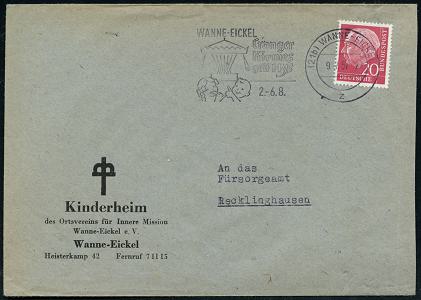 8108 | 15 € | PL-Raum 46.. (ohne Dortmund, Bochum, Gelsenkirchen) : (21b) WANNE-EICKEL 1/ z/ Cranger/ Kirmes/ seit 1435 1957 (9.7.) MWSt (2 Kinder, Karussel) Vordruck-Bf.: Kinderheim des Ortsvereins für Innere Mission.. (Bo.7 A, /Erstjahr) | ![]() | |
