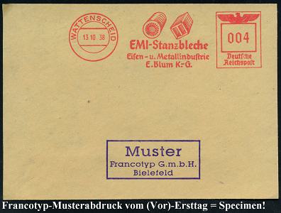 8111 | 35 € | PL-Raum 46.. (ohne Dortmund, Bochum, Gelsenkirchen) : WATTENSCHEID/ EMI-Stanzbleche/ Eisen-u.Metallindustrie/ E.Blum K.-G. 1938 (13.10.) AFS-Musterabdruck Francotyp "Reichsadler" (2 Metall-Formstücke) glasklar gest. Francotyp-Musterblatt vom (Vor)-Ersttag !, selten! (Dü.E-5CGo) | ![]() ![]() | |