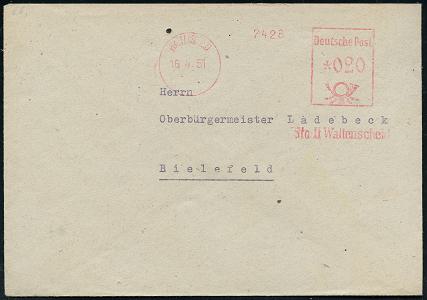 8113 | 18 € | PL-Raum 46.. (ohne Dortmund, Bochum, Gelsenkirchen) : WATTENSCHEID/ Stadt Wattenscheid 1951 (16.4.) ungenormter AFS Francotyp "Posthorm", Absenderklischee unter dem Wertrahmen u. alte Zählnr. , rs. Abs.-Vordruck: Georg Hollenkamp.. (Dü.E-20Ah, ungenormt = Letztjahr!) | ![]() ![]() | |