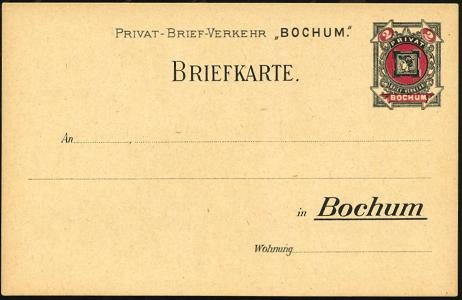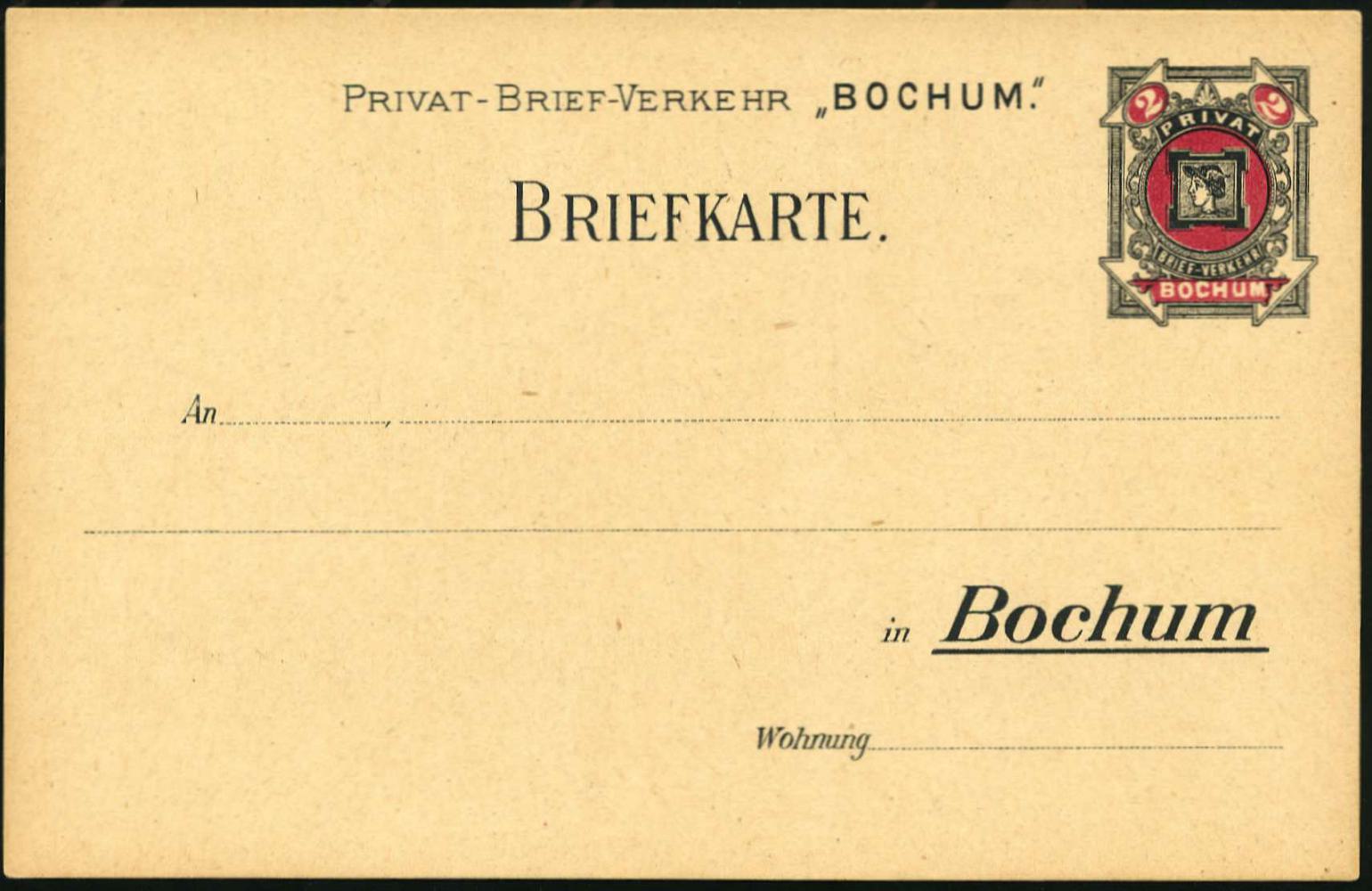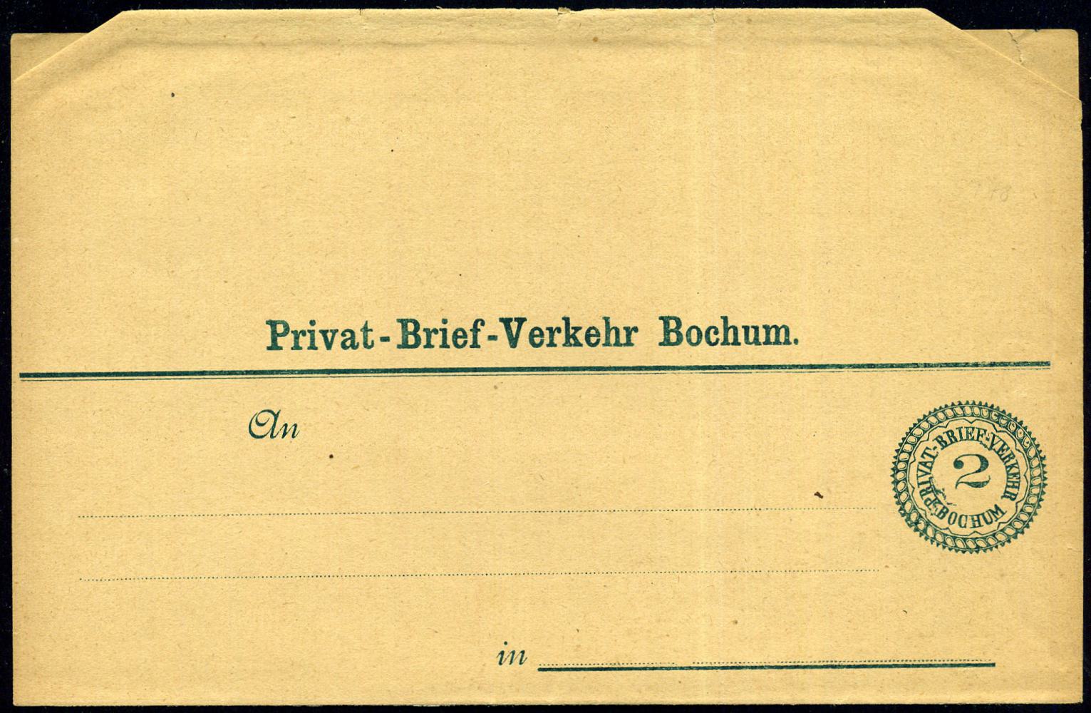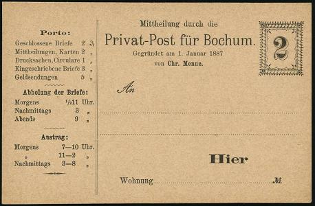 8117 | 18 € | 4630 Bochum allgem. Belege, Tagesstempel, Ganzsachen etc. : Bochum 1887 "Privat-Post für Bochum", 2 Pf. Orts-P., Ziffer Markenimitation, , schwarz, links Tarife!, ungebr. (ME.St.P 3) | ![]() | |