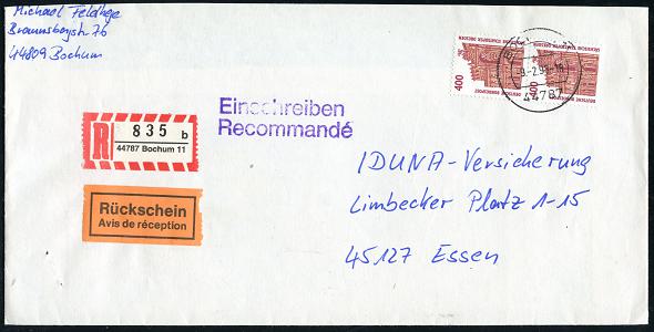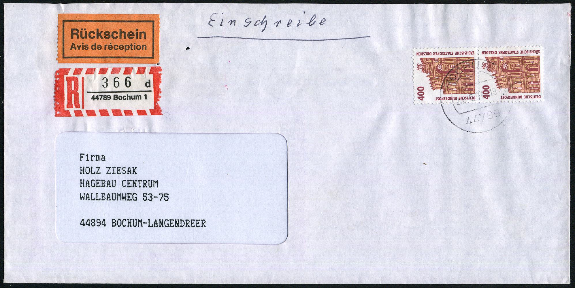 8132 | 15 € | 4630 Bochum allgem. Belege, Tagesstempel, Ganzsachen etc. : 44787 BOCHUM 11 1996 (9.2.) 1K-Segment auf Paar 400 Pf. Staatsoper Dresden + Nassklebe-RZ: 44787 11/b , sauber gest. Inl.-R-Bf. "Rückschein", seltene Portostufe (Mi.1562 MeF) | ![]() | |