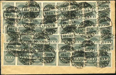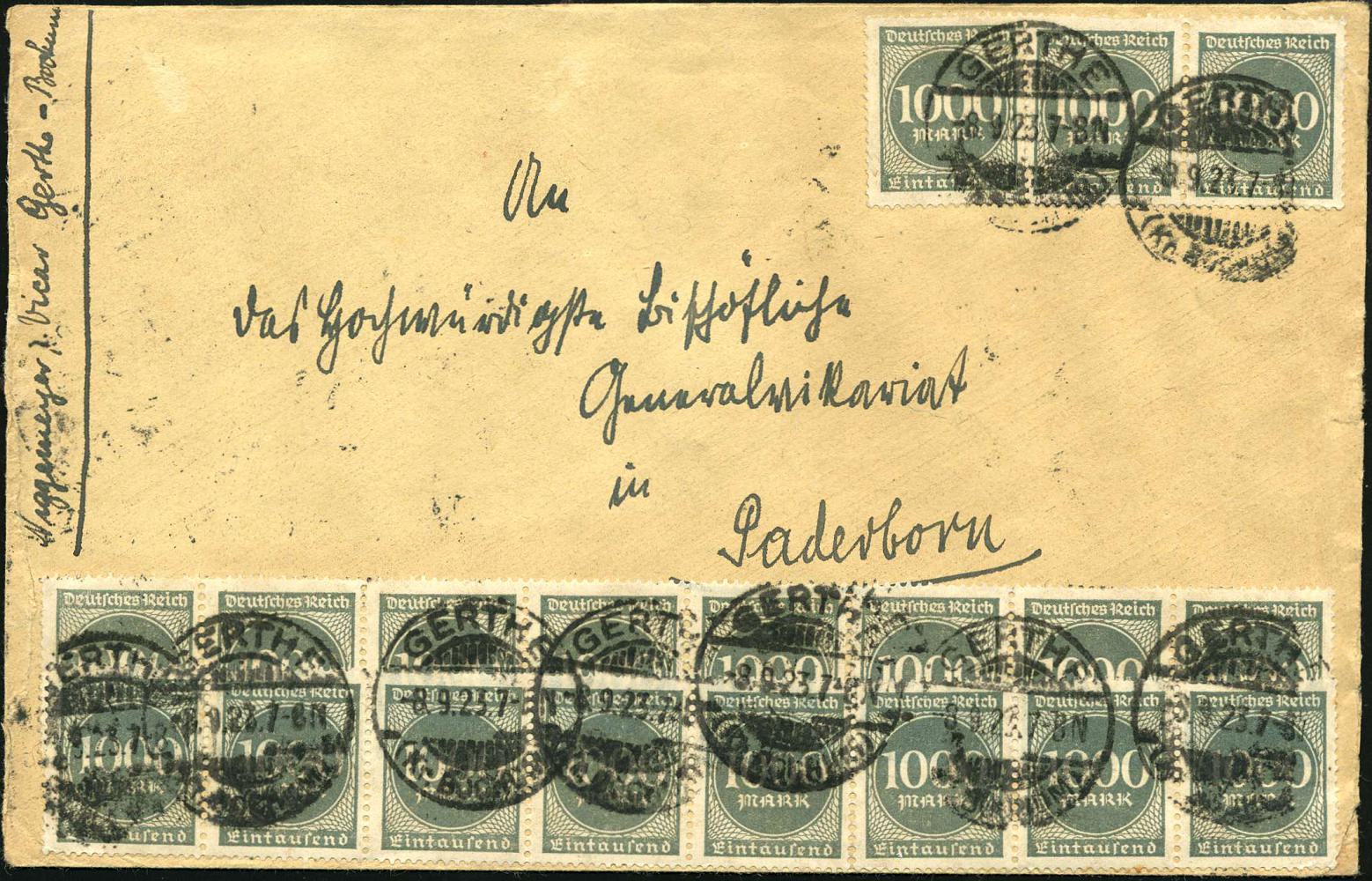 8118 | 75 € | 4630 Bochum allgem. Belege, Tagesstempel, Ganzsachen etc. : Bochum-Gerthe 1923 (8.9.) 1K-Gitter: GERTHE/(Kr.BOCHUM) mehrfach auf Massenfrankatur 1000 Mk. Ziffer, grau meist Treppenfrankatur (teils rs.) insges. 75 Marken = 75.000 Mk., sauber gest. Fernbf., seltene Frankatur! (Mi.273 MeF, Markenwert lose 130.-EUR) | ![]() ![]() | |