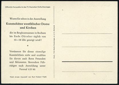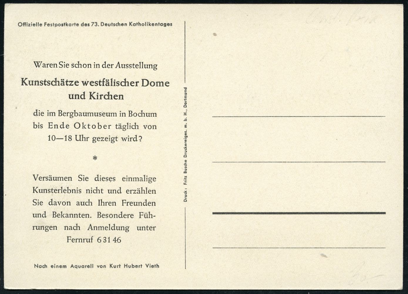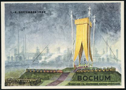 8123 | 25 € | 4630 Bochum allgem. Belege, Tagesstempel, Ganzsachen etc. : Bochum 1949 (Sept.) Künstler-Color-Ak.: 73. DEUTSCHER KATHOLIKENTAG (Kreuzzelt vor Industrieanlagen) sign. "VIETH", ungebr. (Michaelis Nr.1, 50.- DM, 1991) | ![]() ![]() | |