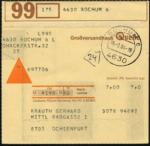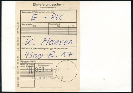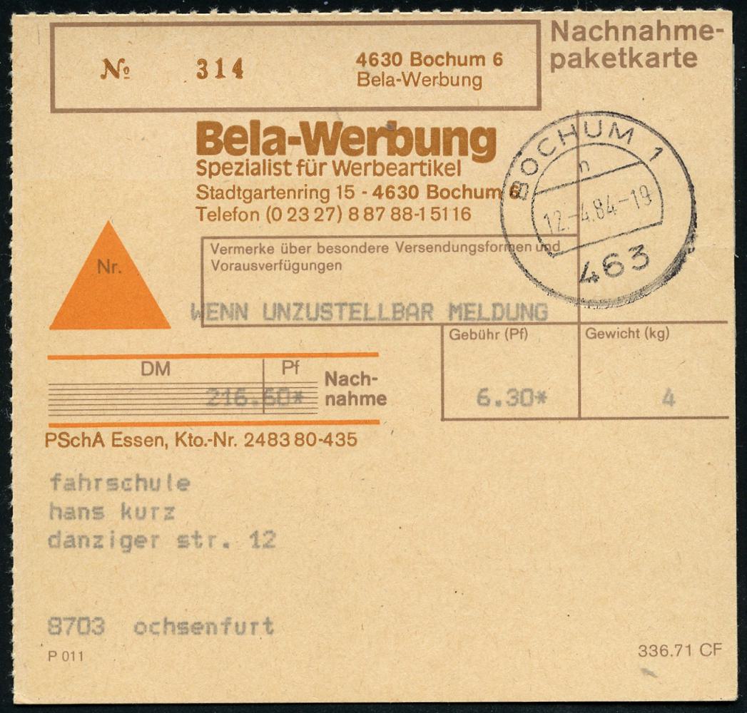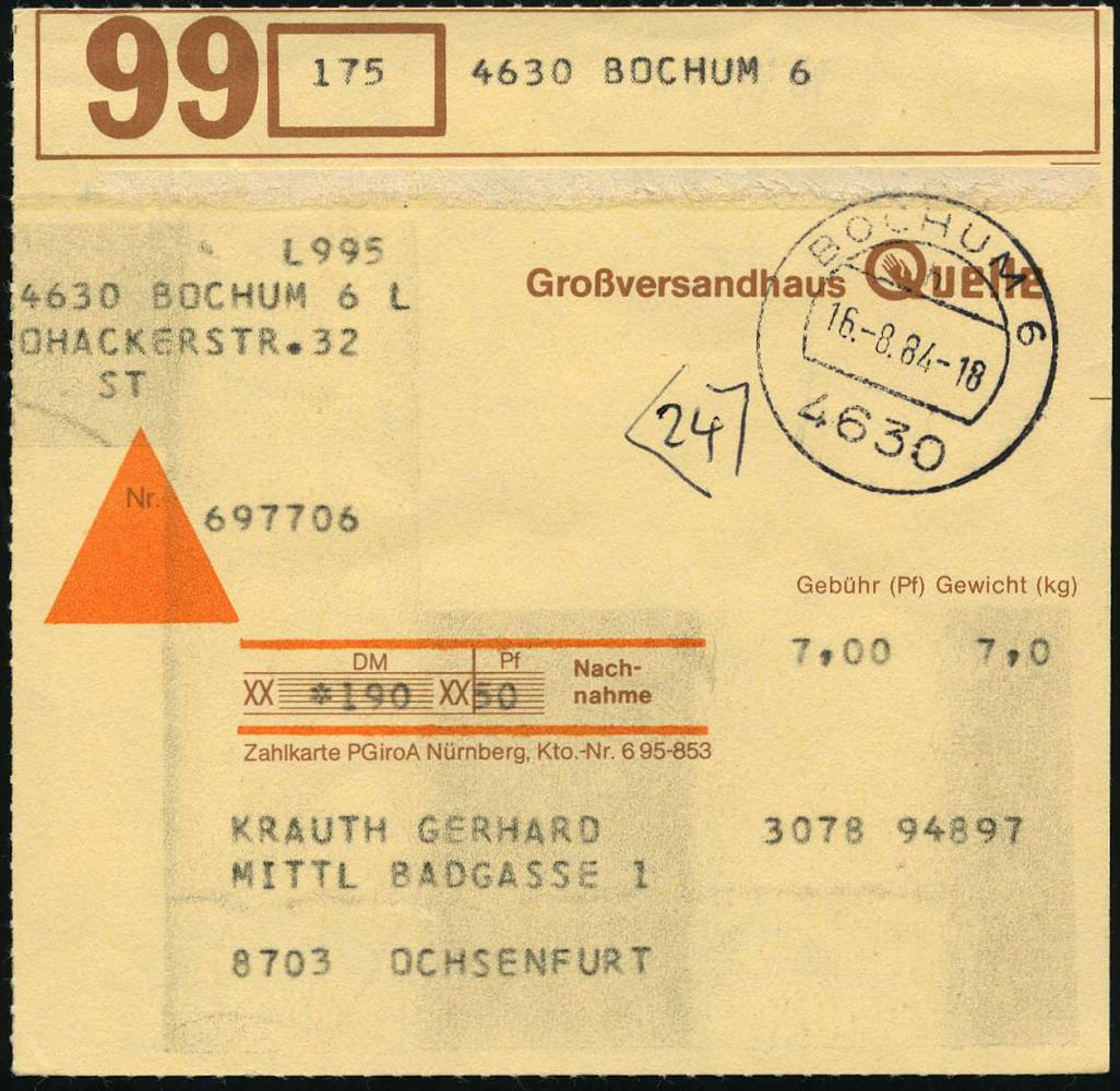 8126 | 15 € | 4630 Bochum allgem. Belege, Tagesstempel, Ganzsachen etc. : 463 BOCHUM 1/ n 1984 (12.4.) 1K-Segment auf Inl.-Selbstbucher-NN-Paket-Kt.: 4630 Bochum 6/ Bela-Werbung mit EDV-Frankatur 6.30* (DM) n. Ochsenfurt | ![]() | |