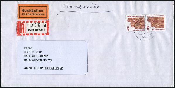 8128 | 15 € | 4630 Bochum allgem. Belege, Tagesstempel, Ganzsachen etc. : 44789 BOCHUM 1/ c 1994 (21.9.) 1K-Segment auf Paar 400 Pf. Oper Dresden + RZ: 44789 Bochum 1/d , Orts-R-Bf. "Rückschein" (Mi.1562 MeF + 10.- EUR) | ![]() | |