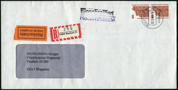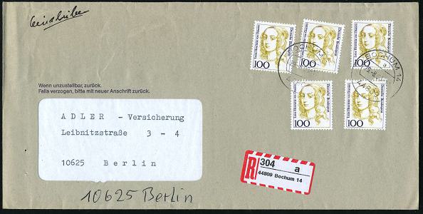8131 | 15 € | 4630 Bochum allgem. Belege, Tagesstempel, Ganzsachen etc. : 44809 BOCHUM 14/ a 1995 (29.8.) 1K-Segment 2x auf 5x 100 Pf. Luise v. Oranien, reine MeF + Selbstklebe-RZ: 44809 Bochum 14/a , sauber gest. Inl.-R-Bf. (Mi.1756 MeF) | ![]() | |