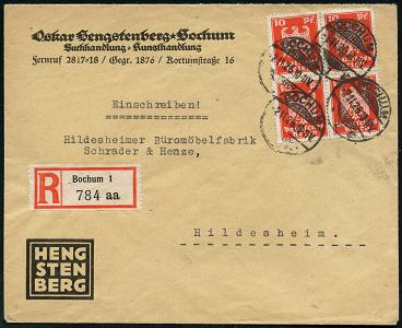 8119 | 20 € | 4630 Bochum allgem. Belege, Tagesstempel, Ganzsachen etc. : BOCHUM/ *1g 1926 (2.11.) 1K-Gitter 4x auf 4er-Block 10 Pf. Adler, rot + RZ: Bochum 1/ a a , Firmen-R-Bf.: Oskar Hengstenberg.. Buchhandlung - Kunsthandlung.. n. Hiildesheim. rs. AS. (Mi.356 MeF) | ![]() | |