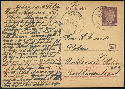 8122 | 35 € | 4630 Bochum allgem. Belege, Tagesstempel, Ganzsachen etc. : BOCHUM 1/ ae 1944 (10.6.) 2K-Steg 2x auf Inl.-P 6 Pf. Hitler (kl. Eckbugspur) + roter OKW-Band-Zensurstpl. "A. c." = Köln (Rie.C-40, +30 Pkte.) Ausl.-Zensur-Kt. (wahrscheinlich von einem "Fremd"- oder Zwangsarbeiter) n. Rotterdam = Inland-"Europa"-Tarif ! (Mi.P 299) | ![]() ![]() | |