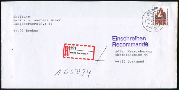 8130 | 15 € | 4630 Bochum allgem. Belege, Tagesstempel, Ganzsachen etc. : 44892 BOCHUM 7/ f 1995 (24.2.) 1K-Segment auf EF 450 Pf. Bauwerke + Selbstklebe-RZ: 44892 Bochum 7 , klar gest. Fern-R-Bf. (Mi.1623 EF + 10.- EUR) | ![]() | |