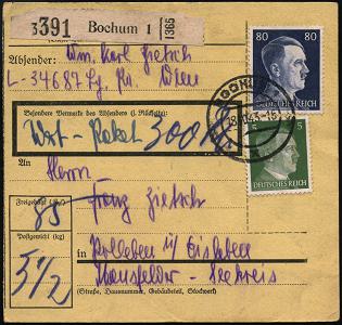 8121 | 20 € | 4630 Bochum allgem. Belege, Tagesstempel, Ganzsachen etc. : BOCHUM 1/ x 1943 (18.10.) 2K-Steg auf Hitler 5 Pf. u. 80 Pf. + schw. Paketzettel: Bochum 1 , hs. Abs.: Fp. Nr. "L 34 687 Lg Pa Wien" = 4. Battr. Flak Rgt. 8, klar gest. Inl.-Feldpost-Wertpaketkt. "300.- Mk". (Mi.784, 798) | ![]() | |