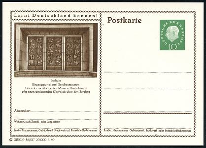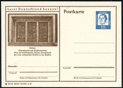 8124 | 15 € | 4630 Bochum allgem. Belege, Tagesstempel, Ganzsachen etc. : Bochum 1960/63 BiP 10 Pf. Heuss u. 15 Pf. Luther: Relief-Portal des Bergbaumuseums , je ungebr. (Einzelverkauf möglich: je 8.- EUR) 2 Belege (Mi.P 42, P 81) | ![]() ![]() | |