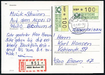 8125 | 18 € | 4630 Bochum allgem. Belege, Tagesstempel, Ganzsachen etc. : 4630 BOCHUM 25/ a 1981 (2.1.) 1K-Segment auf MeF 100 Pf. ATM (2 Stück) + RZ: 4630 Bochum 25/a + R-Einl.-Schein (rs. angeklebt), Inl.-ET-R-Karte, R-Karten sind relativ selten! (Mi.1 MeF = FDC) | ![]() ![]() | |