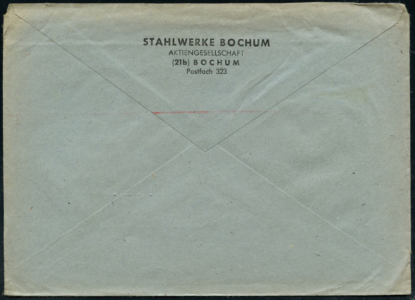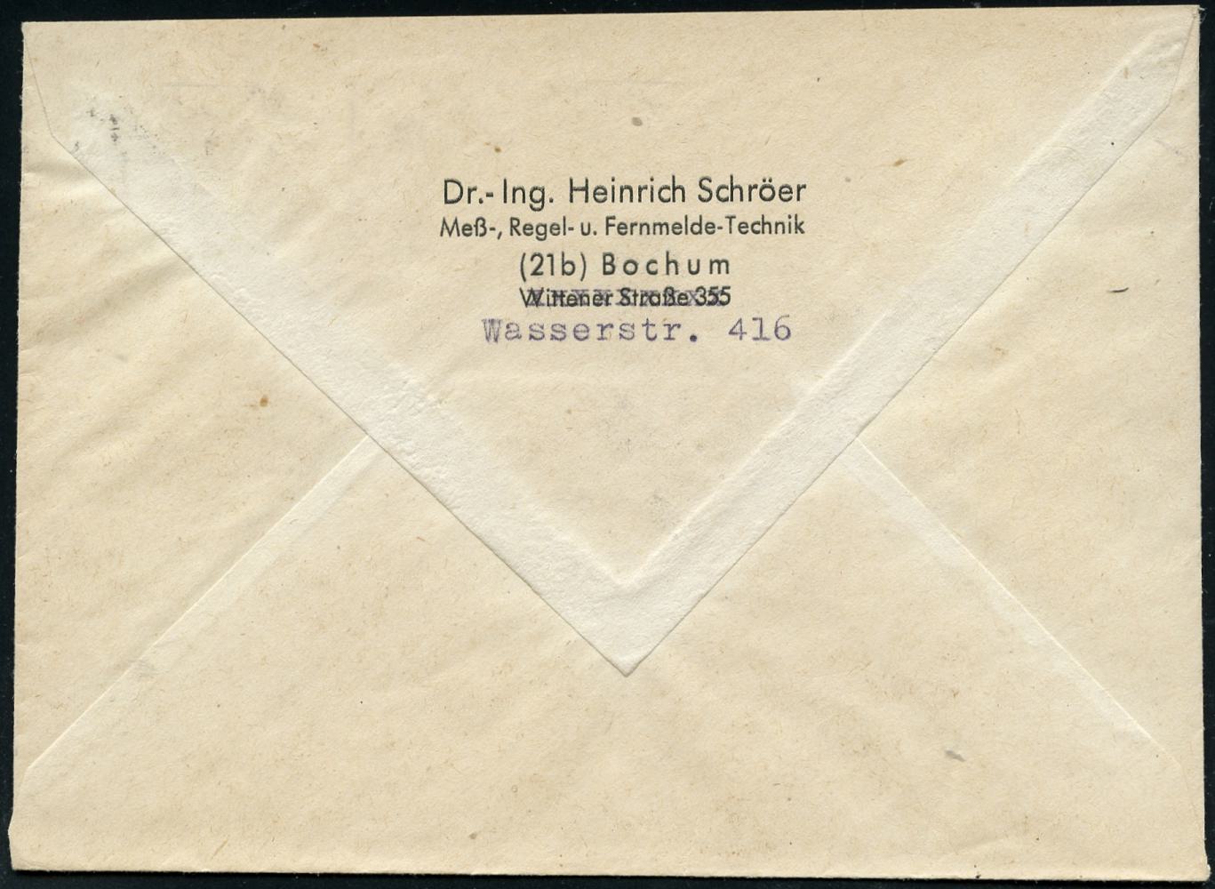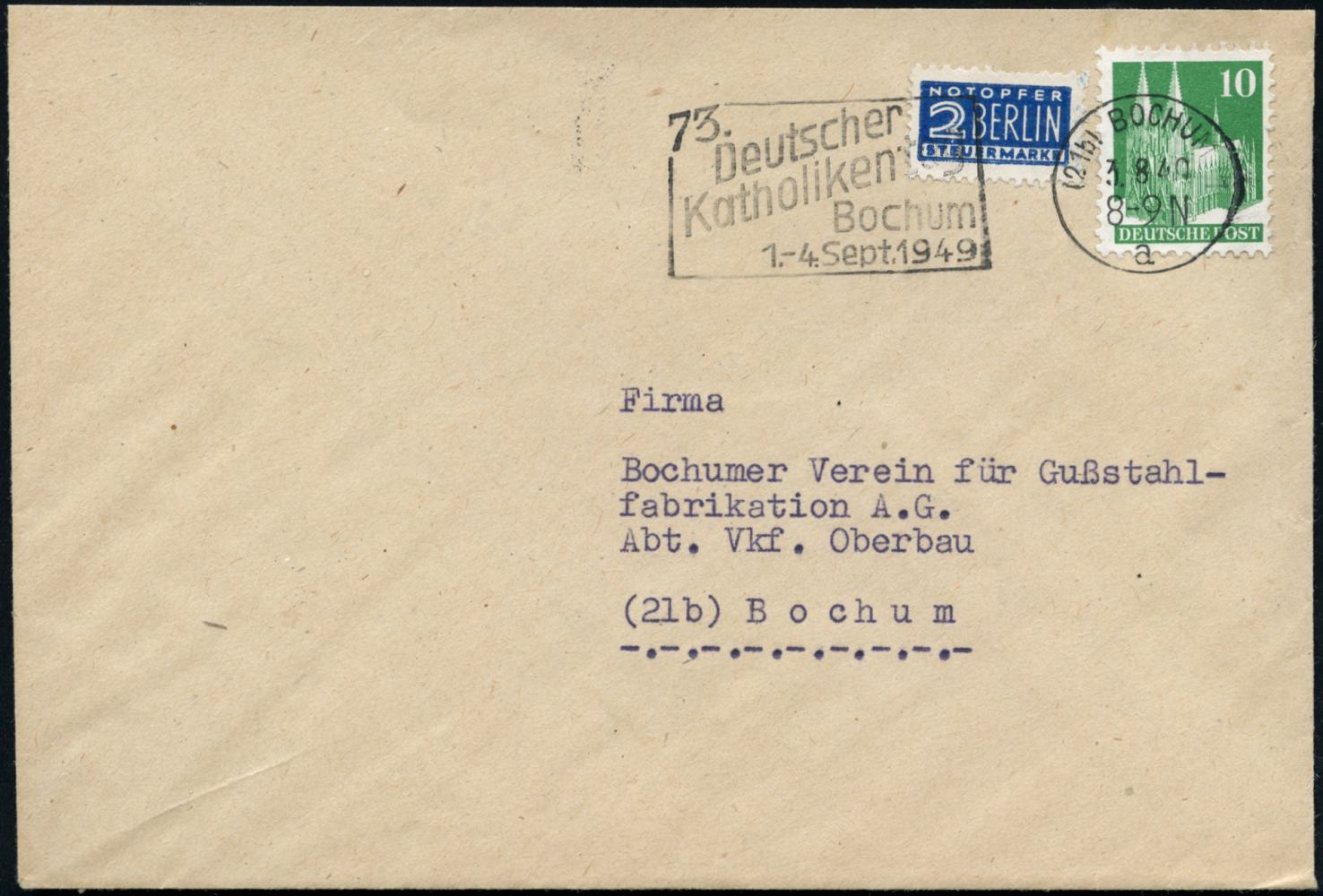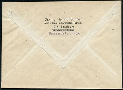 8150 | 15 € | 4630 Bochum Maschinen- u. Serienstempel : (21b) BOCHUM 1/ a/ 73./ Deutscher/ Katholikentag/ Bochum 1949 (3.8.) MWSt auf Bauten-Frankatur + 2 Pf. NoB , klar gest.auf Firmen-Bf., rs. Abs.-Vordruck: Dr. Ing. Heinr. Schröder, Meß-, Regel- u. Fernmelde-Technik (Bo.S 498 A , nur in 2 Orten verwendet!) | ![]() ![]() | |