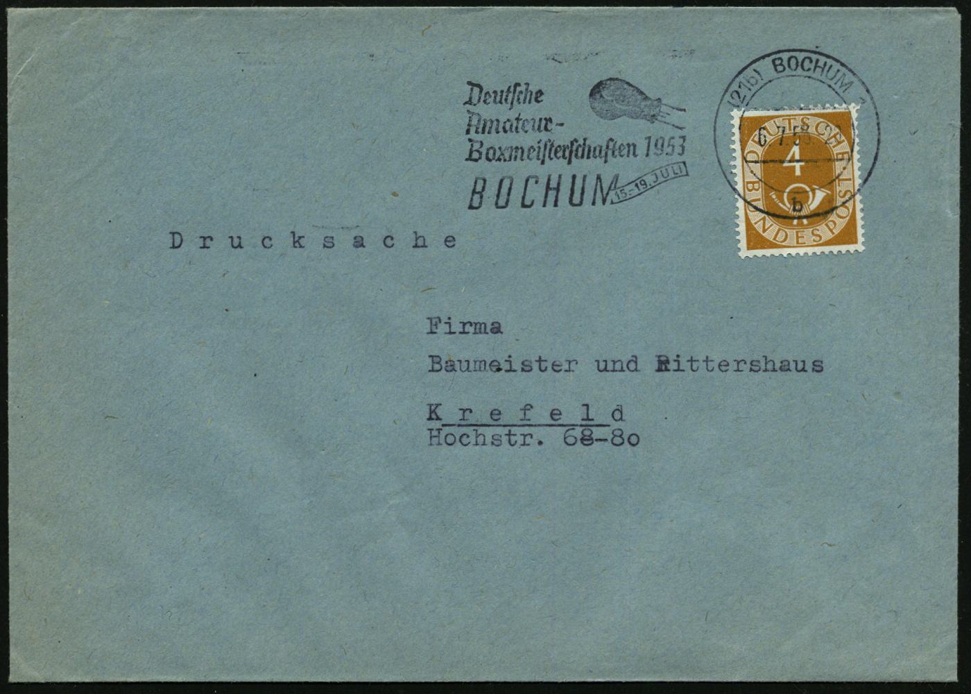 8152 | 20 € | 4630 Bochum Maschinen- u. Serienstempel : (21b) BOCHUM 1/ b/ Deutsche/ Amateur-/ Boxmeisterschaften/ 15.-19.JULI 1953 (6.7.) seltener MWSt (Arm mit Boxhandschuh) klar gest. Inl.-Bf. (Bo.21 A) | ![]() | |