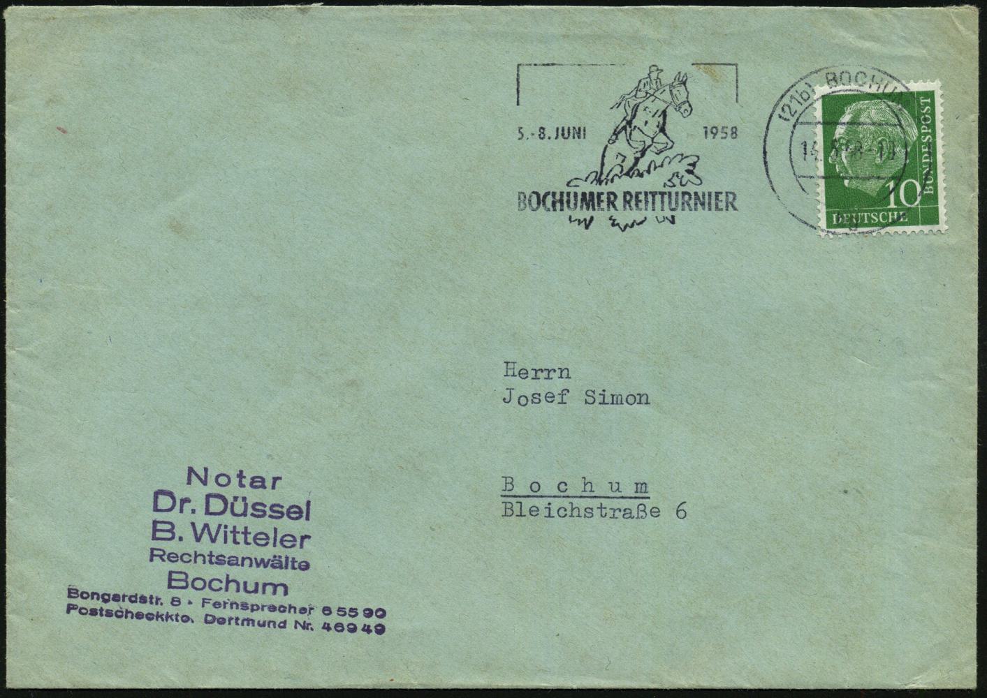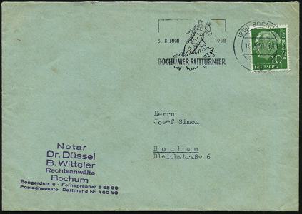 8153 | 14 € | 4630 Bochum Maschinen- u. Serienstempel : (21b) BOCHUM 1/ bg/ 5.-8.JUNI/ BOCHUMER REITTURNIER 1958 (Mai) MWSt = Springreiter , klar gest. Orts-Firmen-Bf. (Bo.39 A) | ![]() | |
