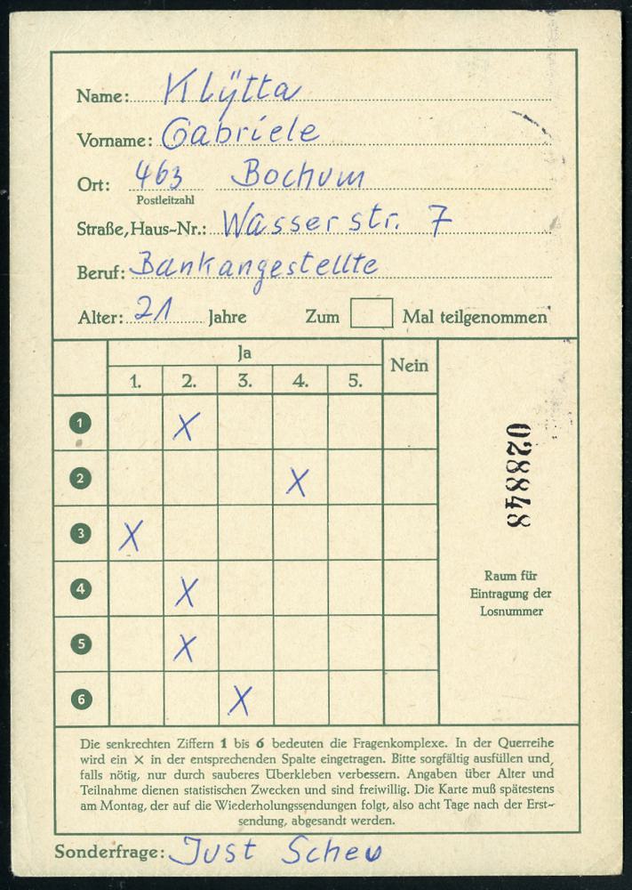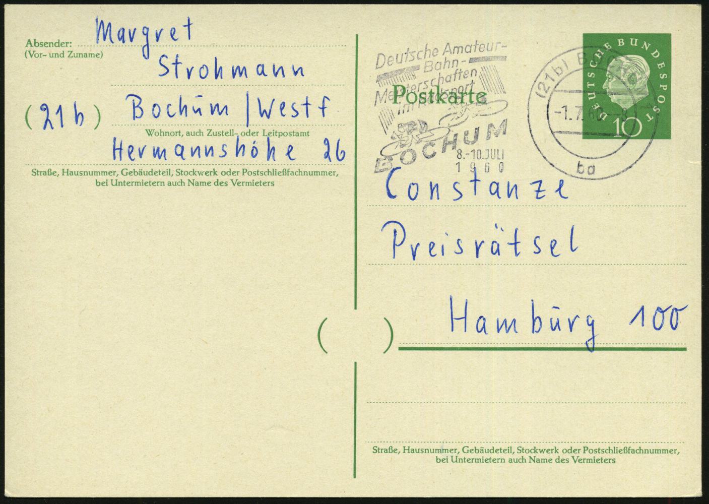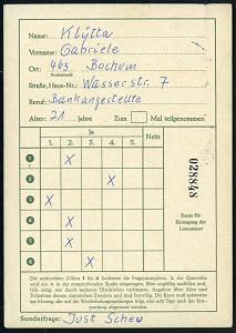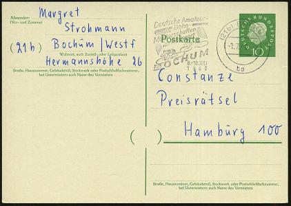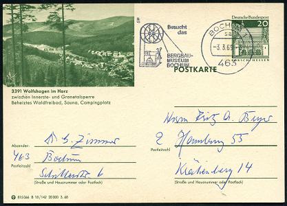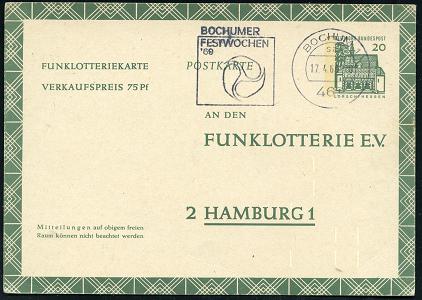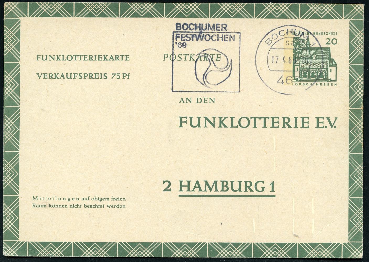 8159 | 16 € | 4630 Bochum Maschinen- u. Serienstempel : 463 BOCHUM 1/ sa/ BOCHUMER/ FESTWOCHEN/ ´69 1969 (17.4.) MWSt (Logo) auf Funklotterie-P 20 Pf. Lorsch, grün (Mi.FP 12) codierte Fern-Kt. mit weißer Matrix-Codierung (AEG-Telefunken) n. Hambg., seltene Verwendung! (Bo.86 A) | ![]() ![]() | |