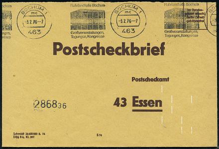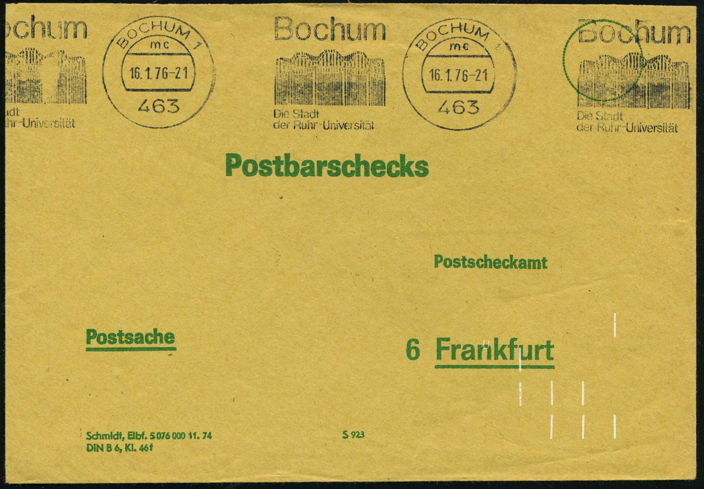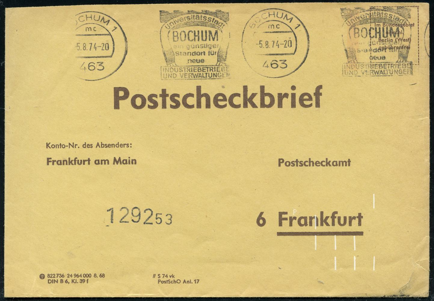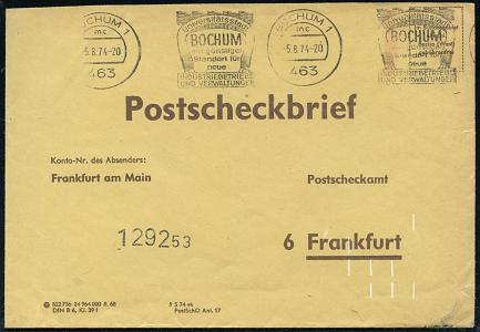 8160 | 16 € | 4630 Bochum Maschinen- u. Serienstempel : 463 BOCHUM 1 1974 Band-MWSt + weiße Matrix-Codierung (AEG-Telefunken) auf gelben PSch-Bf mit Lumo-Balken (gelb) für PSch-Amt 6 Ffm. (Bo.80 Bd) | ![]() | |