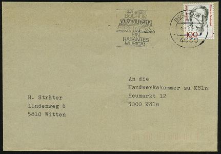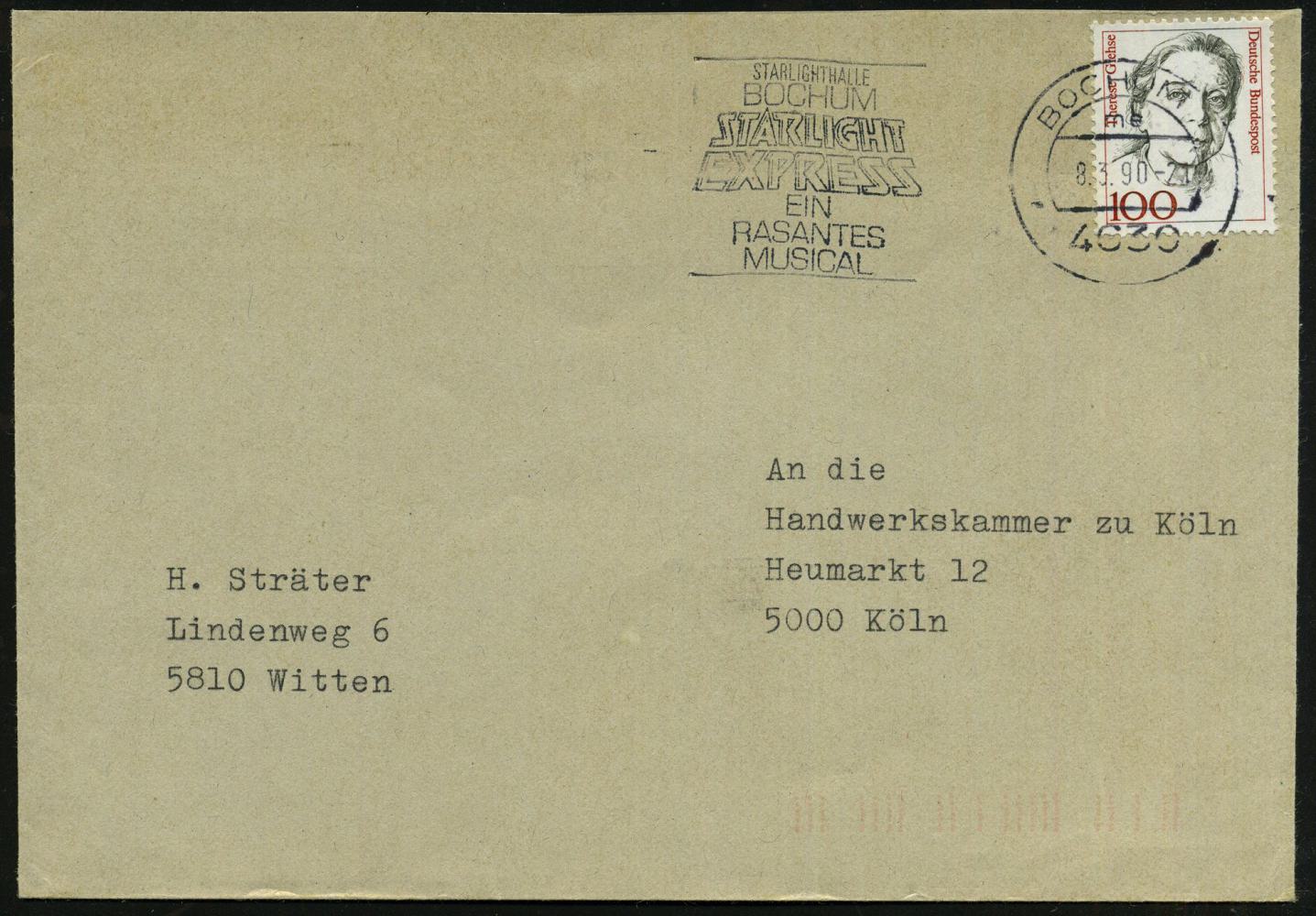 8164 | 6 € | 4630 Bochum Maschinen- u. Serienstempel : 4630 BOCHUM 1/ me/ ..STARLIGHT/ EXPRESS/ EIN/ RASANTES/ MUSICAL 1990 (8.3.) MWSt auf Bedarfs-Bf. | ![]() | |