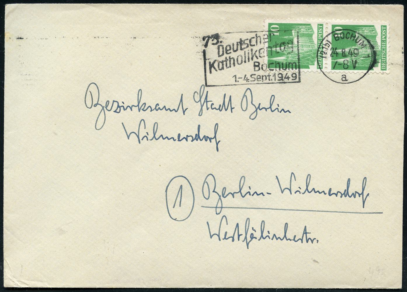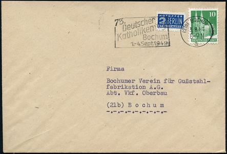 8149 | 20 € | 4630 Bochum Maschinen- u. Serienstempel : (21b) BOCHUM 1/ a/ 73.Deutscher/ Katholikentag/ Bochum.. 1949 (24.8.) MWSt (Halbstempel) auf Paar 10 Pf. Bauten (eng gez.) o h n e 2 Pf. Notopfer, notopferbefreiter Fern-Bf. n. West-Berlin (Bo.S 498 A, nur in 2 Orten verwendet) | ![]() | |
