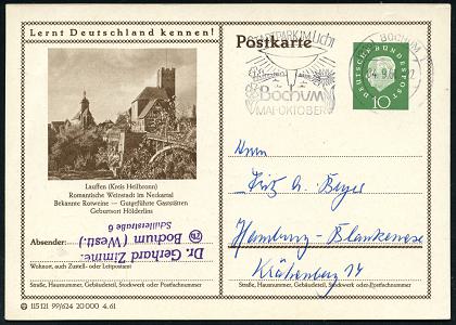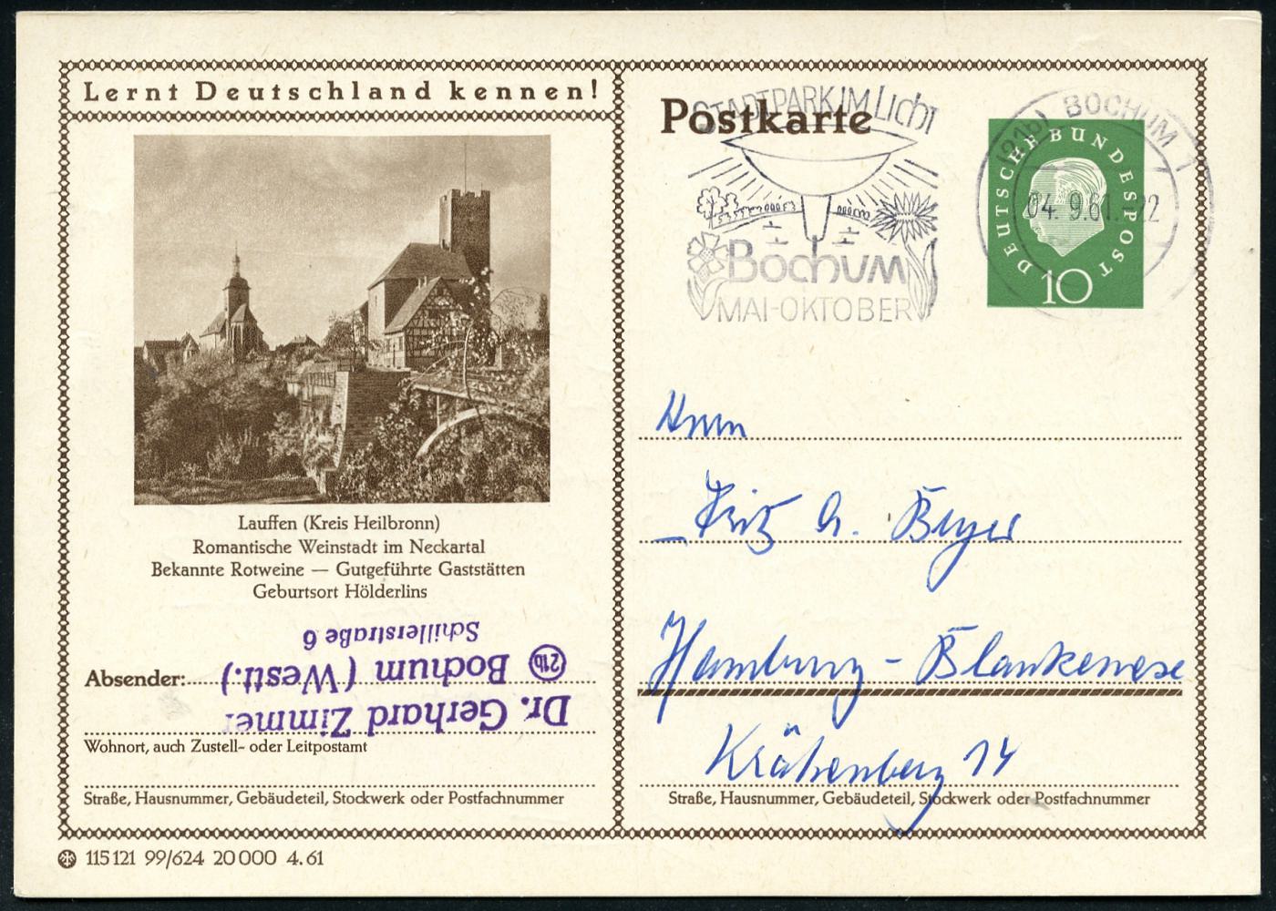 8155 | 10 € | 4630 Bochum Maschinen- u. Serienstempel : (21b) BOCHUM 1/ b/ STADTPARK IM LICHT/ Bochum.. 1961 (4.9.) MWSt (Park-Leuchte) auf Bedarfs-Kt. | ![]() | |