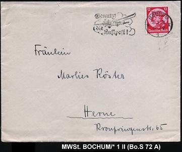 8144 | 14 € | 4630 Bochum Maschinen- u. Serienstempel : BOCHUM/ *1II/ Benutzt/ die/ Luftpost! 1934 (4.1.) MWSt = 3-mot. Flugzeug , klar gest. Fern-Bf.. rs. private Verschlußoblate "tanzendes Kind" (Bo.S 72 A) | ![]() ![]() | |