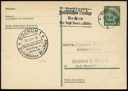 8145 | 25 € | 4630 Bochum Maschinen- u. Serienstempel : BOCHUM/ *1II/ Freilichtbühne Wienkopp/ ..Bis Sept. Sonnt.u.Mittw. 1934 (28.5.) MWSt u n d textgleicher HWSt: BOCHUM 1/Freilichtbühne Wienkopp.. ,seltene Type I (2 Sterne) zus. klar auf Inl.-Karte (Bo.4 Ty.I + 5 A) | ![]() | |