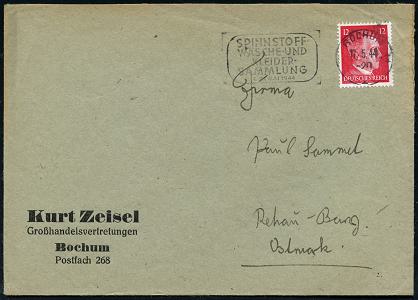 8146 | 28 € | 4630 Bochum Maschinen- u. Serienstempel : BOCHUM/ 1/ I/ SPINNSTOFF-/ WÄSCHE-U./ KLEIDER-SAMMLUNG.. 1944 (17.5.) seltener MWSt klar auf Firmenbf.: Kurt Zeisel.. (Bo.S 418 A, nur 3 Wochen verwendet!) | ![]() | |