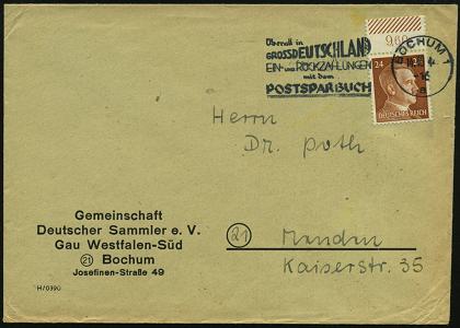 8147 | 18 € | 4630 Bochum Maschinen- u. Serienstempel : BOCHUM 1/ a/ Überall in/ GROSSDEUTSCHLAND/ EIN-u.RÜCKZAHLUNGEN/ mit dem/ POSTSPARBUCH 1944 (14.10.) MWSt klar auf Bedarfs-Bf. GDS e.V. mit PLGZ-Vordruck (Bo.S 408 A , nur 1 1/2 Jahre Verwendet!) | ![]() | |