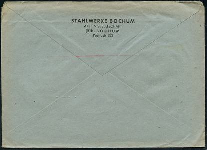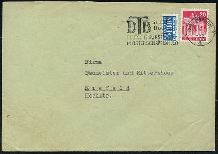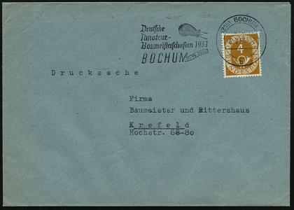 8151 | 18 € | 4630 Bochum Maschinen- u. Serienstempel : (21b) BOCHUM 1/ a/ DTB/ DEUTSCHE/ KUNSTTURN-MEISTERSCHAFTEN 1951 (Apr.) MWSt auf Bauten-Frankatur + 2 Pf. NoB (Monogramm) Bedarfs-Bf. (Bo.17 A) | ![]() ![]() | |