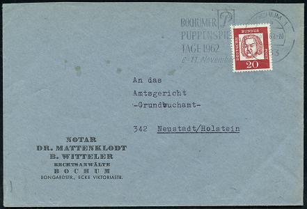 8156 | 14 € | 4630 Bochum Maschinen- u. Serienstempel : 463 BOCHUM 1/ sb/ BOCHUMER/ PUPPENSPIEL-/ TAGE 1962 (26.10.) MWSt auf Firmenbf. (Bo.55 A) | ![]() | |