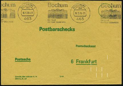 8162 | 20 € | 4630 Bochum Maschinen- u. Serienstempel : 463 BOCHUM 1/ mc/ ..Ruhr-Universität 1976 (16.1.) Band-MWSt + weißer Matrix-Code (AE-Telefunken) + weißer Platz-Code: "U" auf grün- gelben Post-Innendienstbf. "Postbarschecks" für PSchA 6 Frankfurt/Main, seltene Verwendung!, seltener PSCH-Innendienst! | ![]() | |