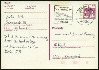 8163 | 8 € | 4630 Bochum Maschinen- u. Serienstempel : 4630 BOCHUM 1/ sa/ Ausstellung/ DAS TIER UND WIR.. 1983 (Juni) MWSt = Seehund , Bedarfs-Kt. (Bo.167 A II) | ![]() | |