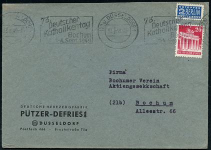 8148 | 20 € | 4630 Bochum Maschinen- u. Serienstempel : Bochum / Düsseldorf 1949 (3.8.) BandMaWSt: (22 a) DÜSSELDORF 1/73.Deutscher/Katholikentag/Bochum.. auf EF 20 Pf. Bauten, weit gez. + 2 Pf. NoB mit Zähnungsausfall links (3 Zähnungslöcher fehlen), Firmen-Bf.: DEUTSCHE HEBEZEUGEFABRIK PÜTZER-DEFRIESI.., vergl. Kat.-Nr.8149 (Bo.S 498 Bd, nur in 2 Orten verwendet) | ![]() | |