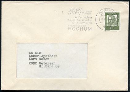 8157 | 15 € | 4630 Bochum Maschinen- u. Serienstempel : 463 BOCHUM 1/ sa/ 25.TAGUNG/ DER Deutschen/ Studentenhistoriker../ Universitätsstadt/ BOCHUM 1965 (10.8.) seltener MWSt auf Inl.-Bf. (Bo.68 A) | ![]() | |