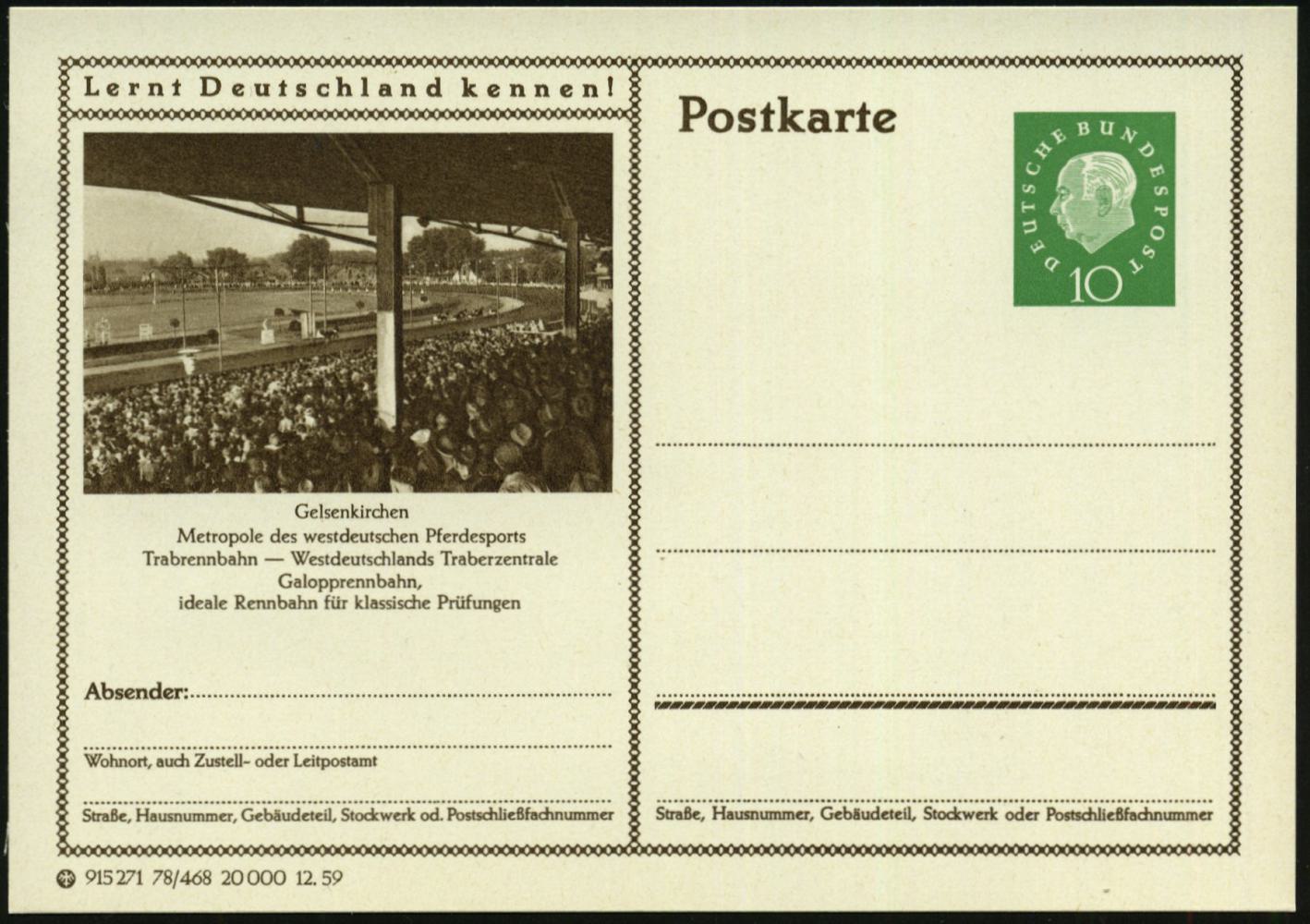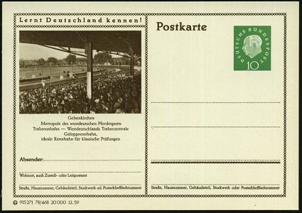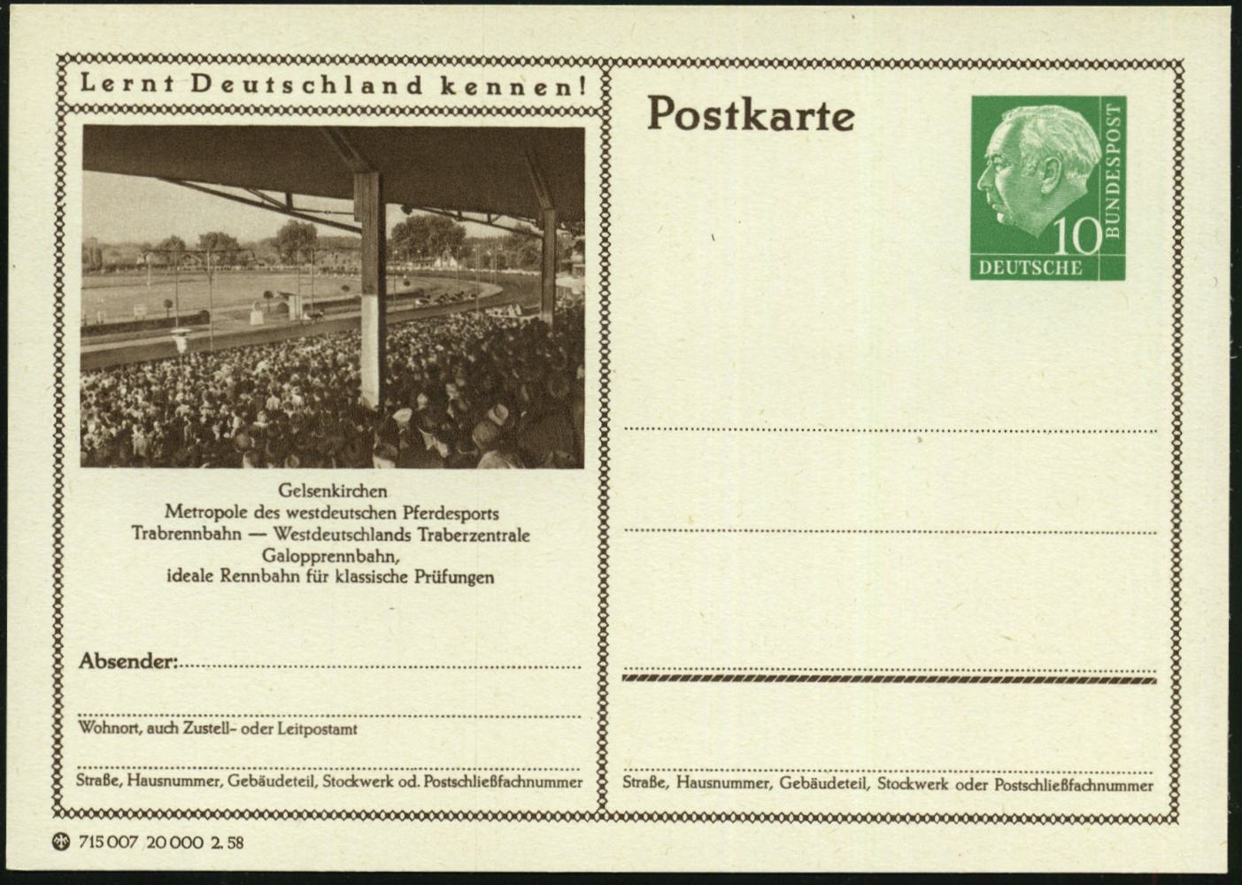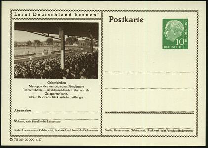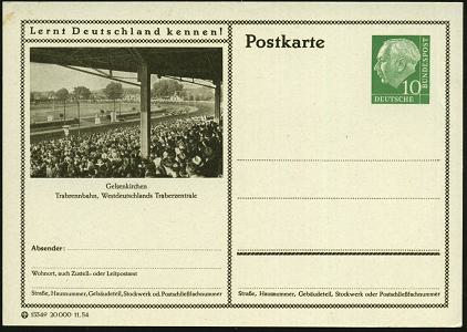 8200 | 10 € | 4650 Gelsenkirchen allgem. Belege, Tagesstempel, Ganzsachen etc. : Gelsenkirchen 1954 10 Pf. BiP Heuss, grün: Trabrennbahn.. (Tribüne, Trabrennen) ungebr. (Mi.P 23/123) | ![]() | |