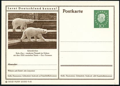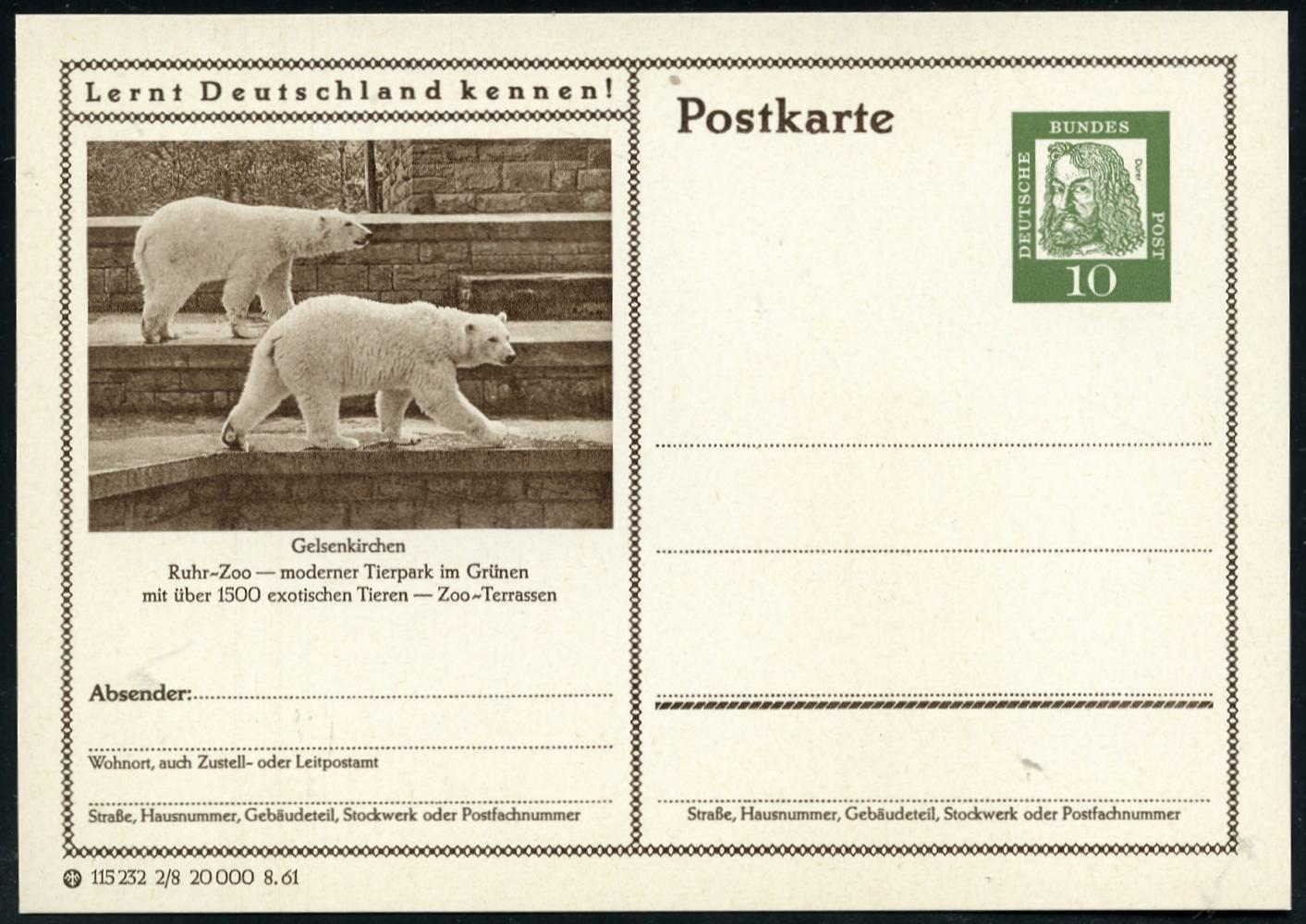 8208 | 10 € | 4650 Gelsenkirchen allgem. Belege, Tagesstempel, Ganzsachen etc. : Gelsenkirchen 1960/61 2 verschied. BiP 10 Pf. Heuss III bzw. Dürer: je Eisbären , je ungebr. (Einzelverkauf möglich: je 6.- EUR) 2 Belege (Mi.P 42, P 65) | ![]() ![]() | |
