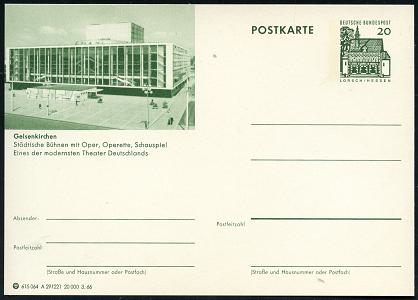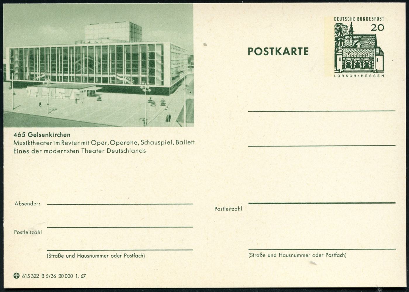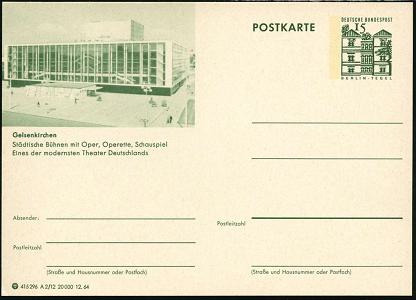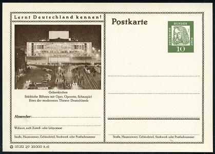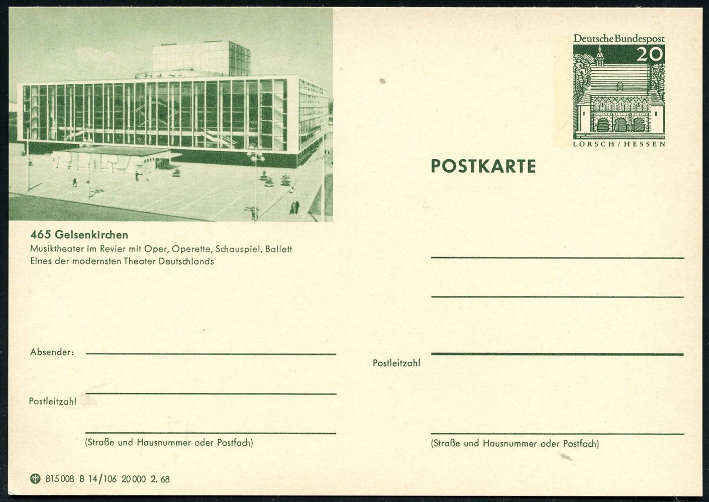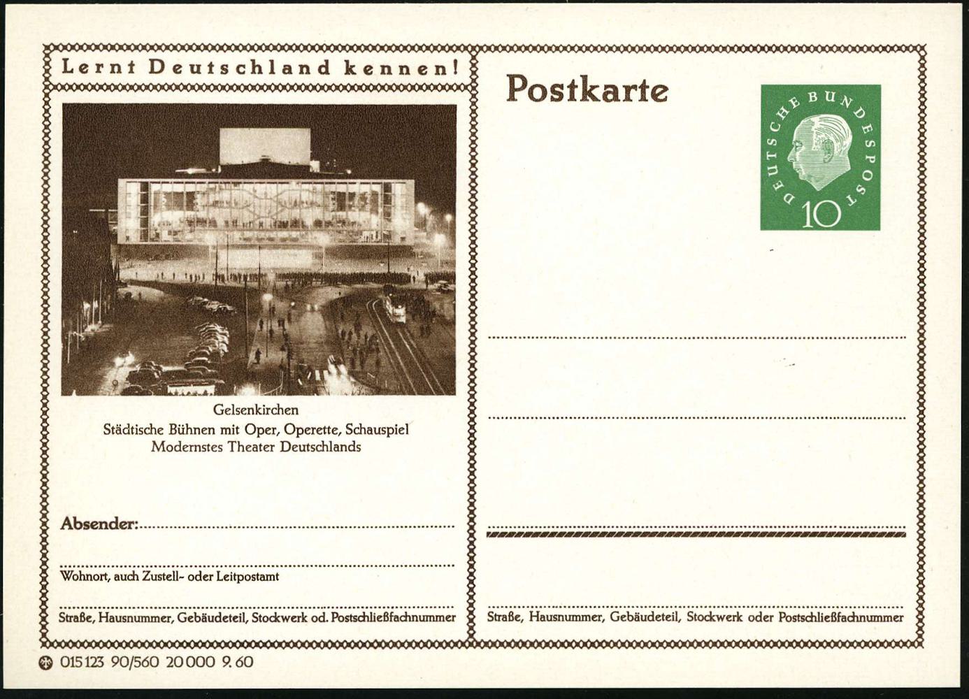 8209 | 10 € | 4650 Gelsenkirchen allgem. Belege, Tagesstempel, Ganzsachen etc. : Gelsenkirchen 1960/61 BiP 10 Pf. Heuss III bzw. 10 Pf. Dürer: Städt. Bühnen mit Oper, Operette, Schauspiel.. , je ungebr. (Einzelverkauf möglich: je 6.- EUR) 2 Belege (Mi.P 42/90-560, P 65/2-9) | ![]() ![]() | |