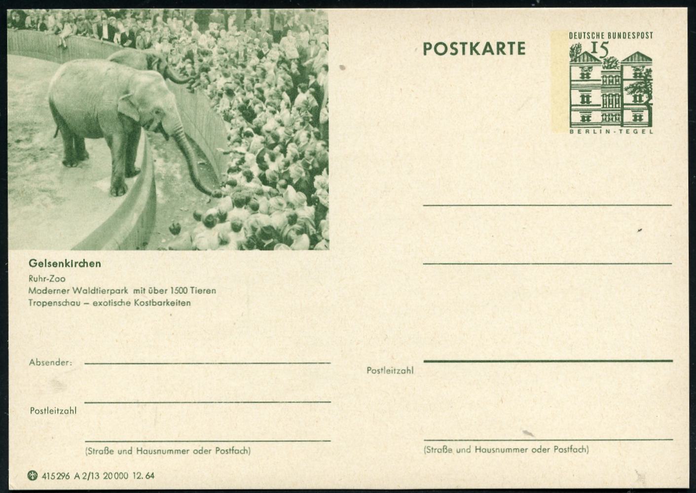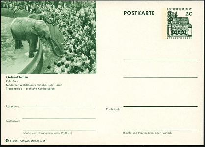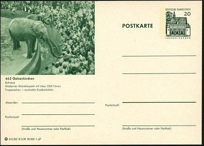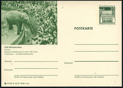 8211 | 20 € | 4650 Gelsenkirchen allgem. Belege, Tagesstempel, Ganzsachen etc. : Gelsenkirchen 1964/68 4 verschied. BiP 15 Pf. Tegel bzw. 20 Pf. Lorsch, grün: Ruhr-Zoo, Elefanten alle ungebr. (Einzelverkauf möglich: je 6.- EUR) 4 Belege (Mi.P 86, P 89, P 91, P 96) | ![]() ![]() ![]() ![]() | |