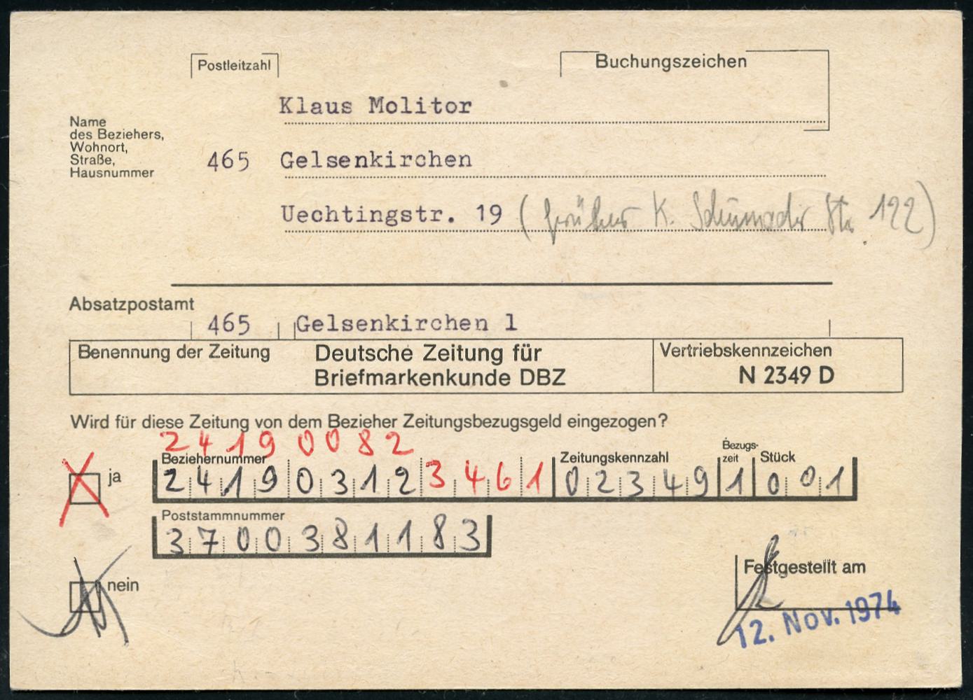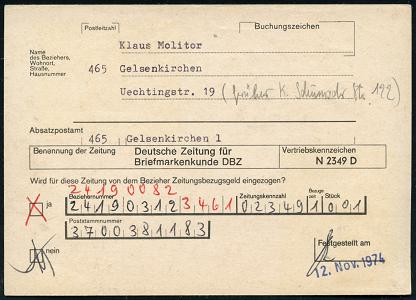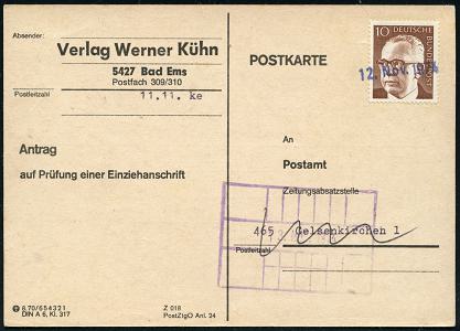 8212 | 25 € | 4650 Gelsenkirchen allgem. Belege, Tagesstempel, Ganzsachen etc. : Gelsenkirchen 1974 (12.11.) blauviol. Datums-1L von Gelsenkirchen auf EF 10 Pf. Heinemann auf "Sammelprüfung einer Einzieher-Anschrift" = niedrigste Portostufe der BRD dieser Zeit! (Info dazu) selten! (Mi.636 EF) | ![]() ![]() | |