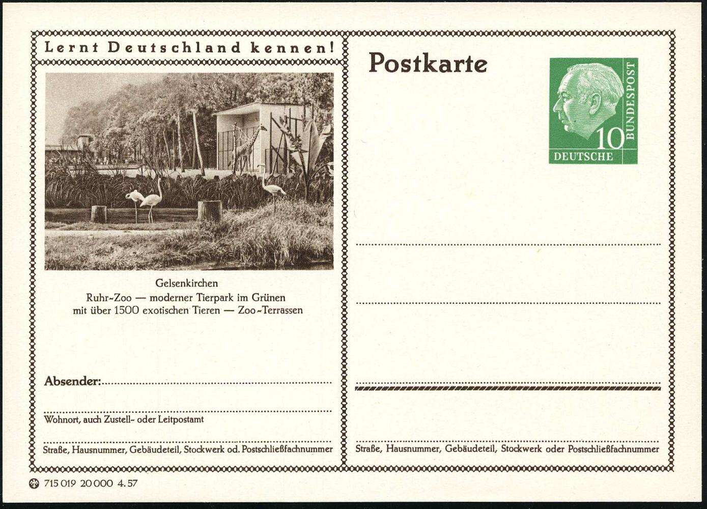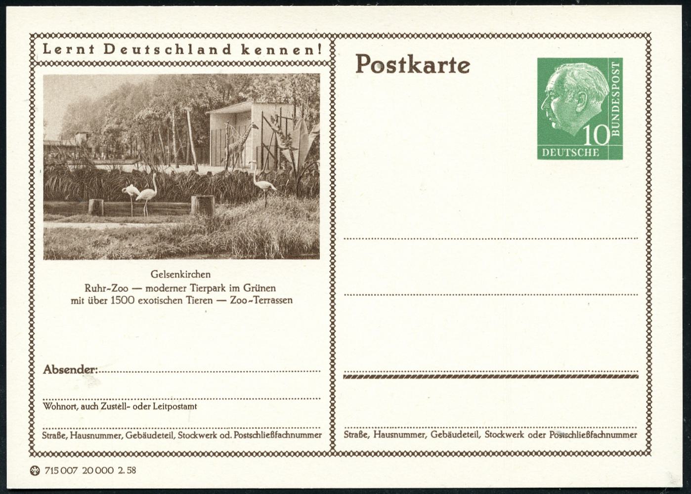8206 | 10 € | 4650 Gelsenkirchen allgem. Belege, Tagesstempel, Ganzsachen etc. : Gelsenkirchen 1959 2 verschied. 10 Pf. BiP Heuss III, grün: Ruhr-Zoo = Flamingos /Giraffe , je ungebr. (Einzelverkauf möglich: je 6.- EUR) 2 Belege (Mi.P 41, 42) | ![]() ![]() | |