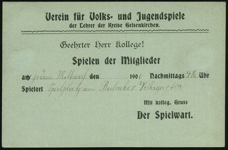 8196 | 20 € | 4650 Gelsenkirchen allgem. Belege, Tagesstempel, Ganzsachen etc. : Gelsenkirchen 1906 amtl. Orts-P 2 Pf. Germania, rs. Zudruck: Verein für Volks- u. Jugendspiele.. (rs. hs. Eintragung) ungebr. | ![]() ![]() | |