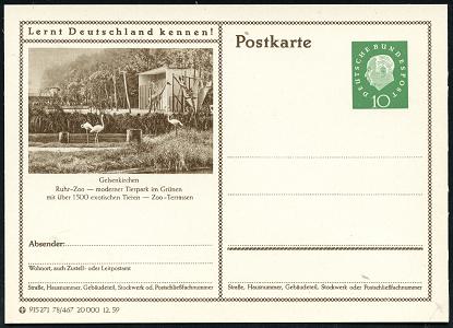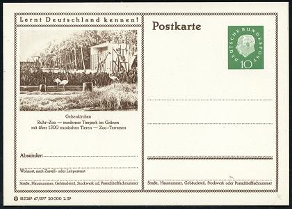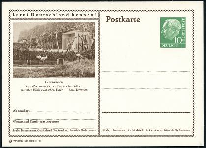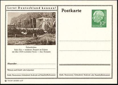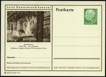 8201 | 7 € | 4650 Gelsenkirchen allgem. Belege, Tagesstempel, Ganzsachen etc. : Gelsenkirchen 1956 10 Pf. BiP Heuss I, grün: Ruhr-Zoo, Zoo-Terrassen.. , ungebr. (Mi.P 24) | ![]() | |