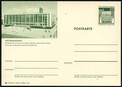 8210 | 20 € | 4650 Gelsenkirchen allgem. Belege, Tagesstempel, Ganzsachen etc. : Gelsenkirchen 1964/68 BiP 15 Pf. Tegel, 20 Pf. Lorsch (3 verschiedene): Städt. Bühnen mit Oper, Operette, Schauspiel.. , alle ungebr. (Einzelverkauf möglich: je 6.- EUR) 4 Belege (Mi.P 86, P 89, P 91, P 96) | ![]() ![]() ![]() ![]() | |