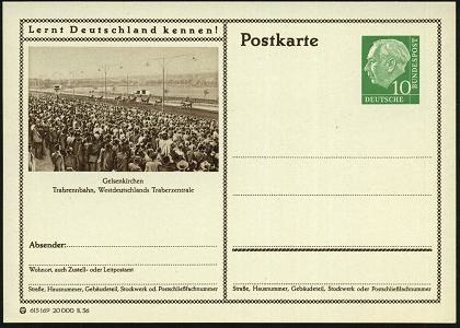 8202 | 6 € | 4650 Gelsenkirchen allgem. Belege, Tagesstempel, Ganzsachen etc. : Gelsenkirchen 1956 10 Pf. BiP Heuss I, grün: Trabrennbahn.. (Traberrennen) ungebr. (Mi.P 24/238) | ![]() | |