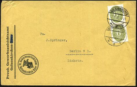 8197 | 16 € | 4650 Gelsenkirchen allgem. Belege, Tagesstempel, Ganzsachen etc. : GELSENKIRCHEN/ *1q 1932 (2.8.) 1K-Brücke 2x auf Dienst 6 Pf. Paar, oliv auf aptiertem Dienst-Bf.: Preuß. Gewerbeaufsichts-amt Gelsenkirchen ("Buer" gestrichen) n. Berlin (Mi.D 128 MeF) | ![]() | |