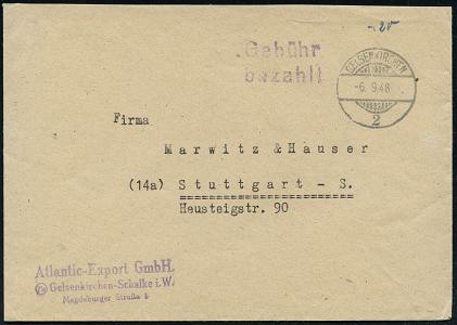 8199 | 20 € | 4650 Gelsenkirchen allgem. Belege, Tagesstempel, Ganzsachen etc. : GELSENKIRCHEN/ 2 1948 (6.9.) 1K-Gitter + viol. 2L: Gebühr/bezahlt , Barfrankatur-Inl.-Bf. n. Stuttgart = Spätdatum nach Währungsreform! (Richter Nr.2056) | ![]() | |