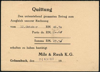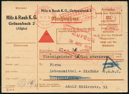 8198 | 25 € | 4650 Gelsenkirchen allgem. Belege, Tagesstempel, Ganzsachen etc. : Gelsenkirchen 1938 (28.11.) roter postamtl. Ra.3: Zurück.. mit Datum von Gelsenkirchen auf NN-Retour-Kt. mit AFS: GRÖNEBACH (BHF)/Allgäuer Limburger/ Milz-Käse (Käsepackung) 023 Pf. n. Gelsenkirchen | ![]() ![]() | |